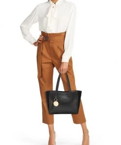 All-leather saddle bag with snakeskin-print front flap and clever hardware inspired by the paper clip.