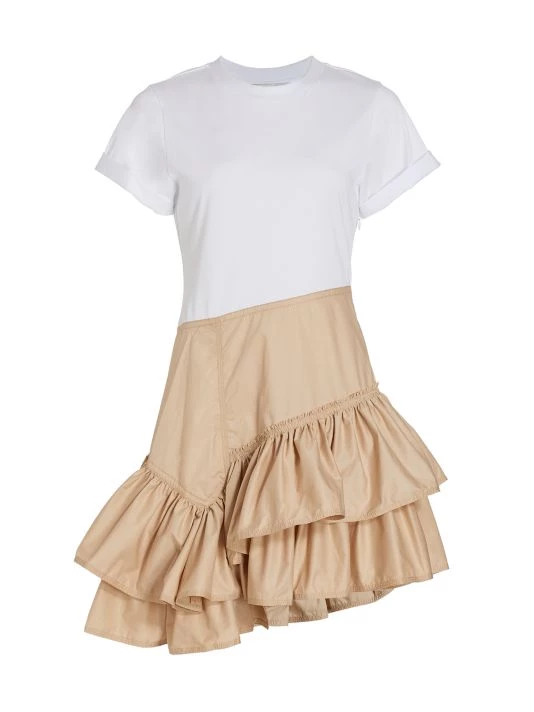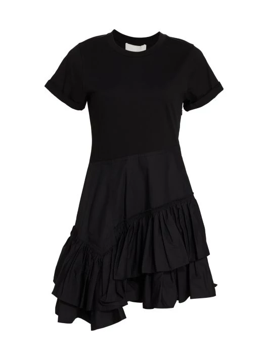 Cut in an asymmetric silhouette, 3.1 Phillip Lim’s mixed-media Flamenco dress is constructed with a T-shirt bodice paired with an intricate tiered ruffle skirt.