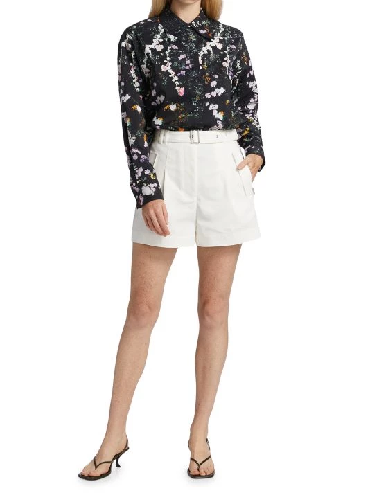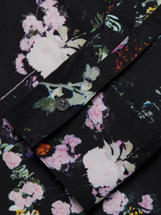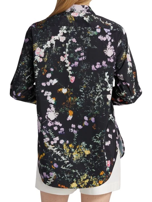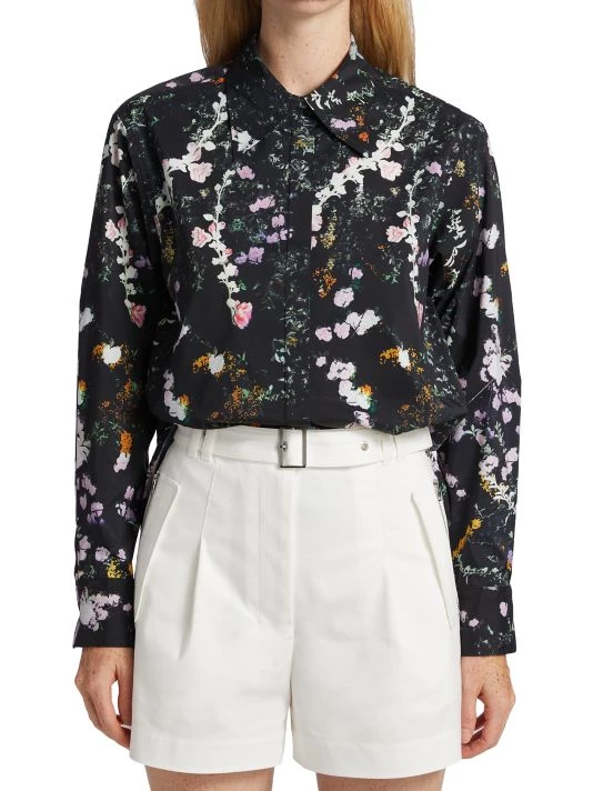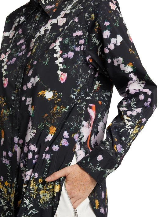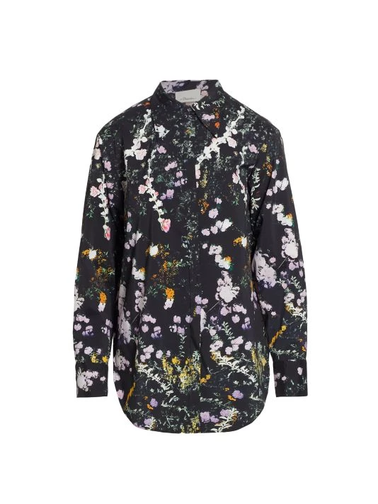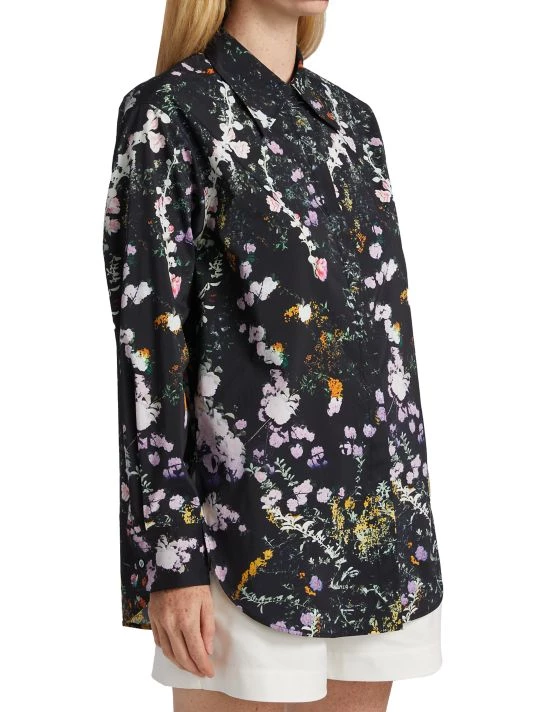 Oversized poplin shirt blooms with a bright floral motif on a dark backing, tailored with a spread collar and concealed button placket.