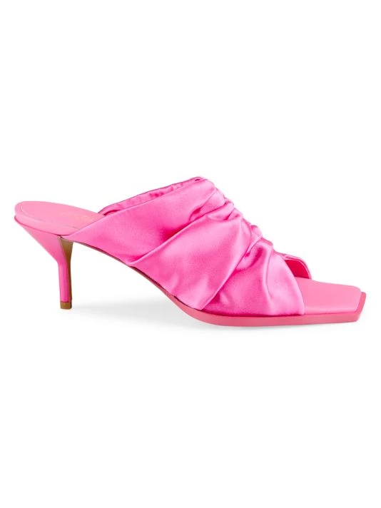 These ruched satin mules boast a modern square toe with an elegant kitten heel.
