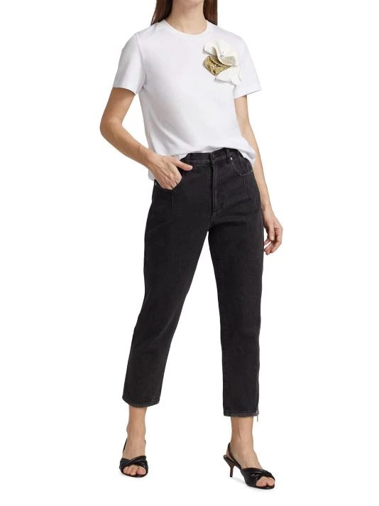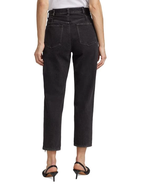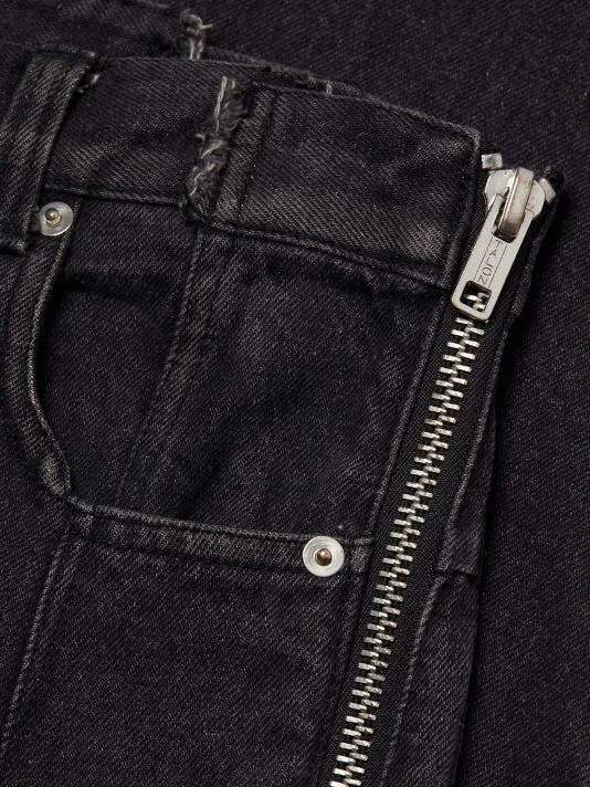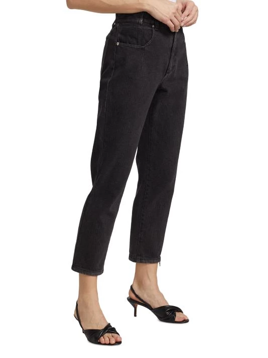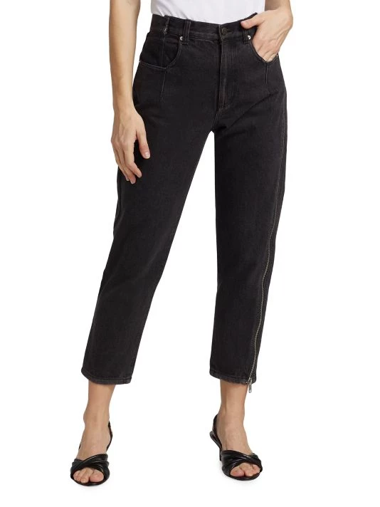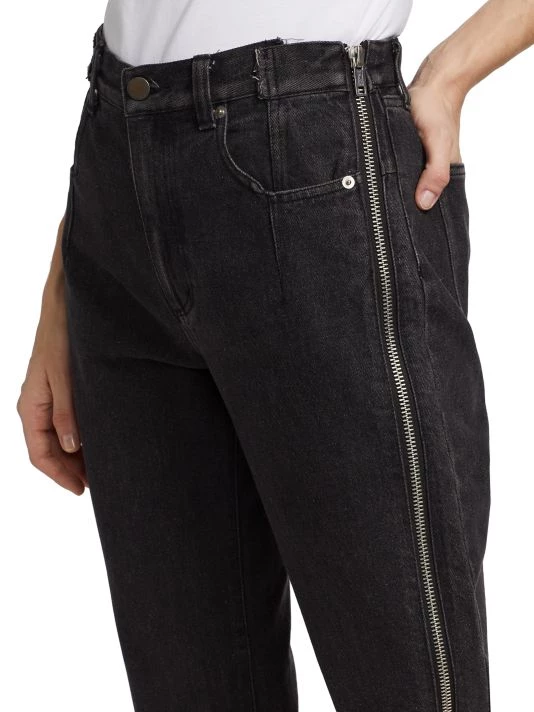 Sliced-and-stitched detailing at the waistband and an elongated zip down one leg add that je ne sais quoi to these tapered jeans.