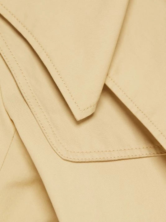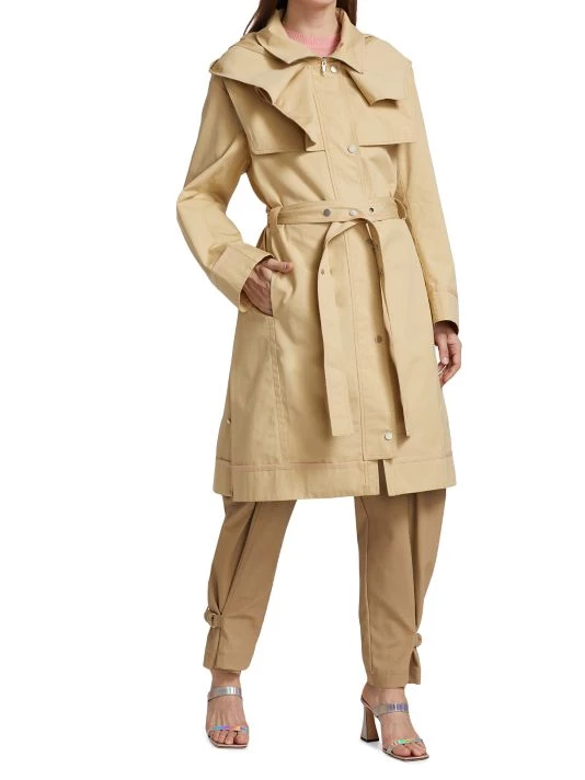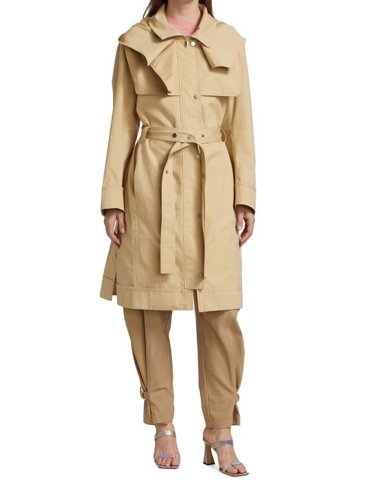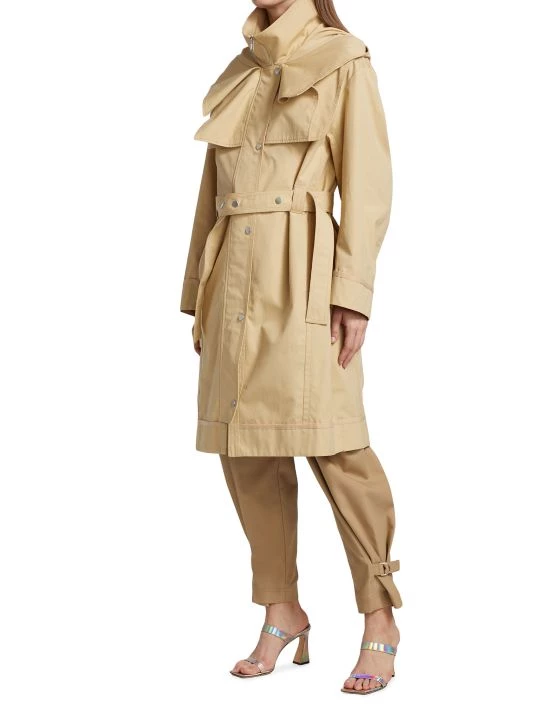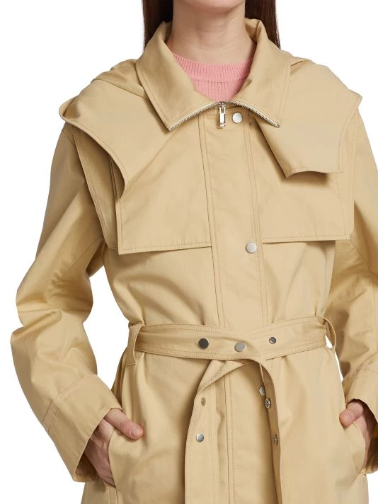 Classic cotton trench coat updated with chic stand collar and hood, cinched with a self-tie belt for a flattering fit.