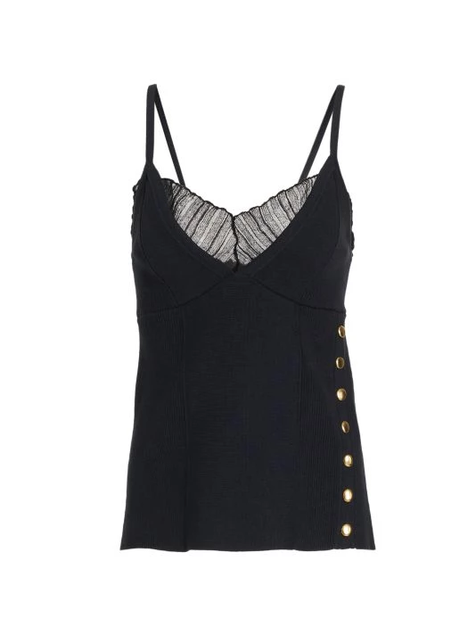 Inset with lace details at the V-neck and back, 3.1 Phillip Lim’s Milano knit cami top is styled with spaghetti straps and goldtone buttons at the side.