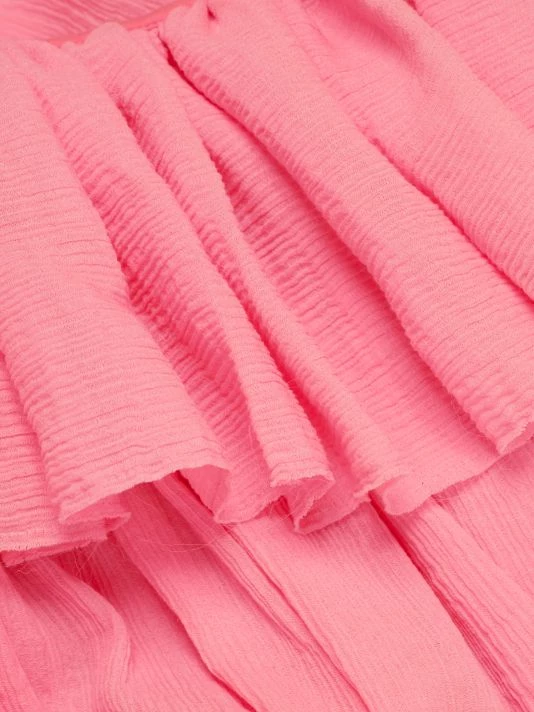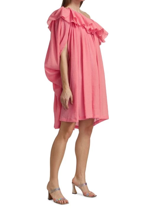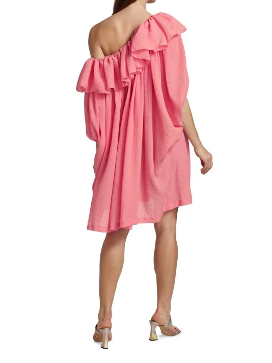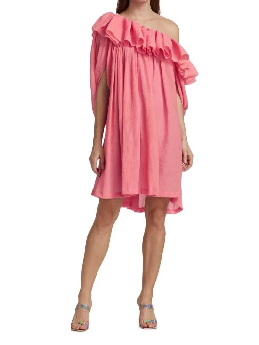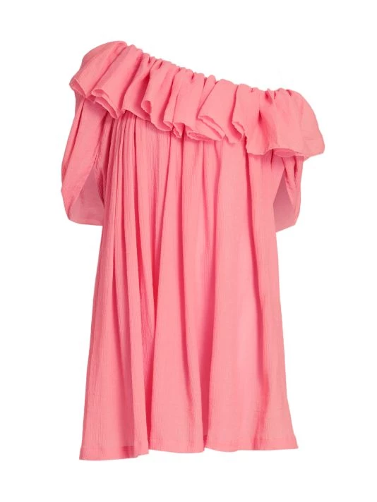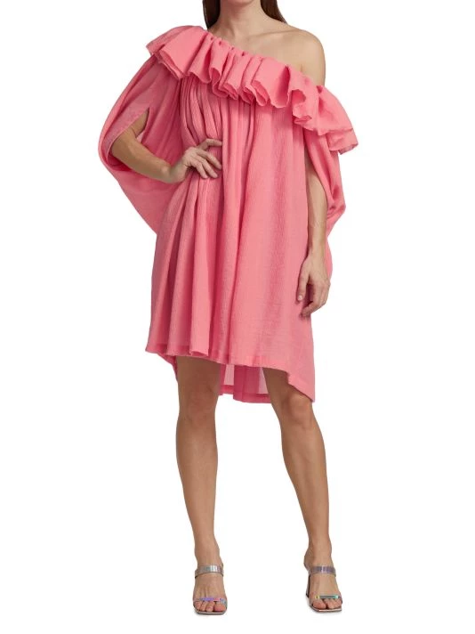 This playful one-shoulder dress has a relaxed shift silhouette, trimmed with ruffles at the neck and framed by slit sleeves.