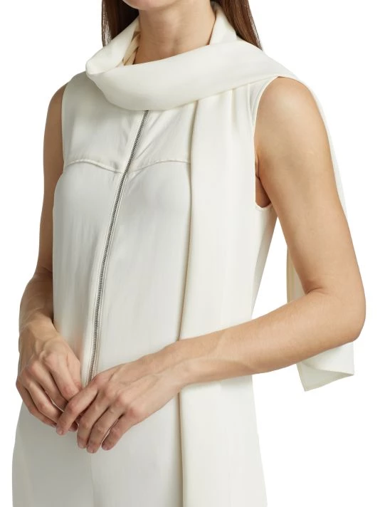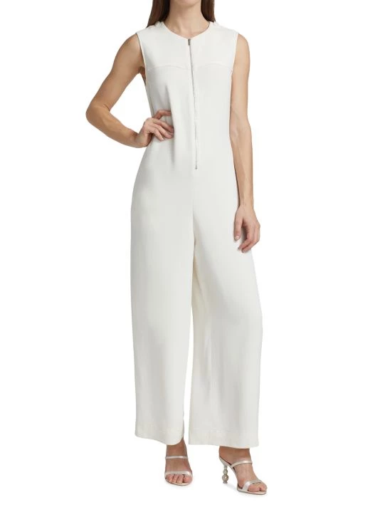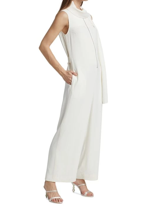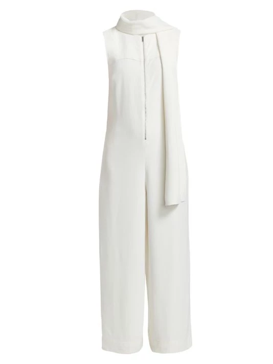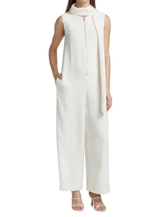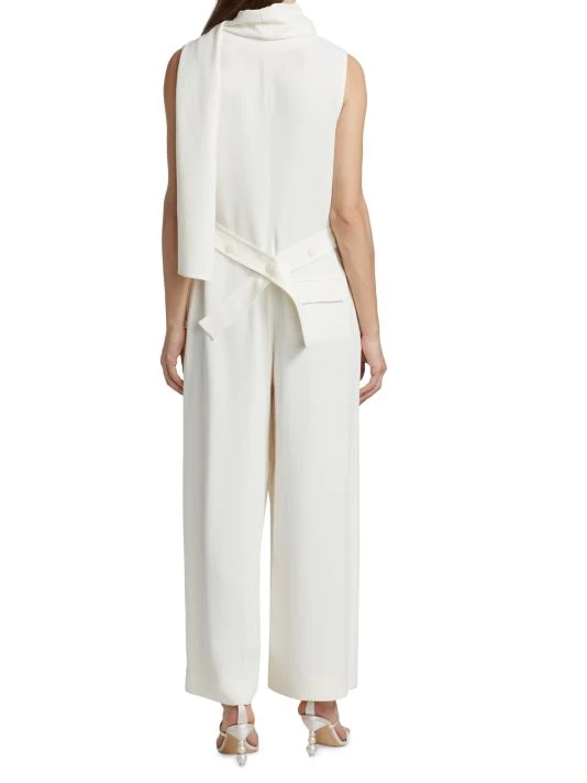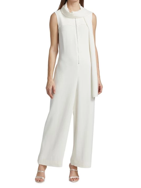 This relaxed crepe jumpsuit highlights the bodice with an optional statement scarf and sweetheart seam, finished in an elongating wide leg and back snap belt.