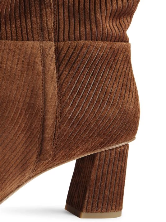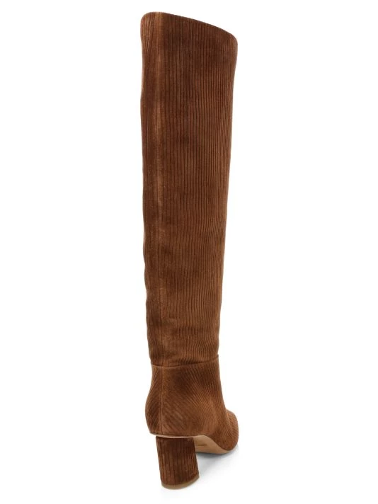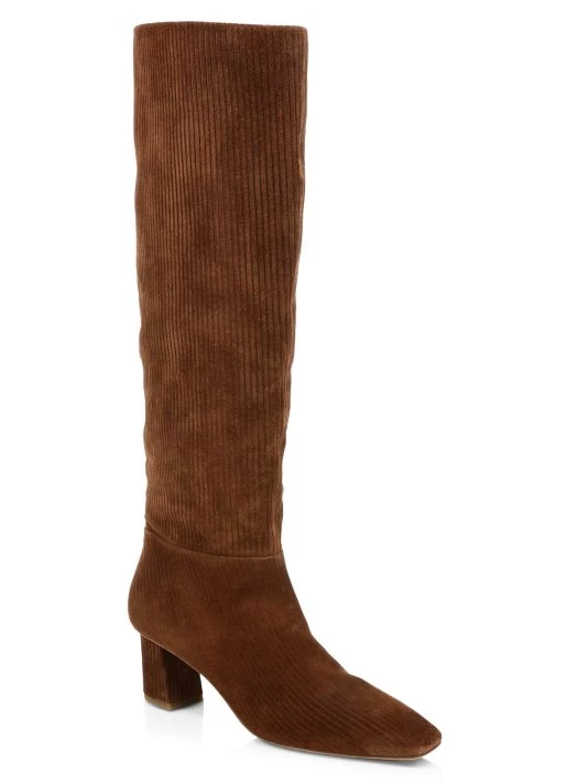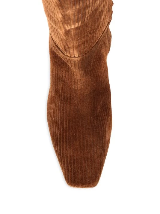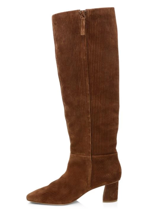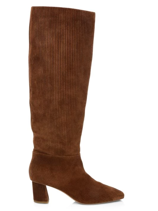 Crafted of texture-rich corduroy suede, these knee-high boots feature classic square toes and low block heels.