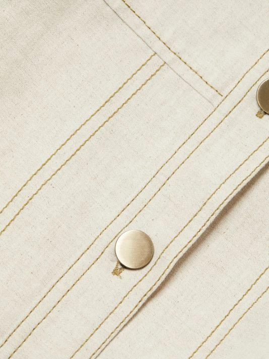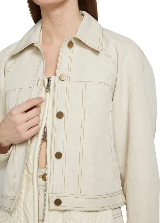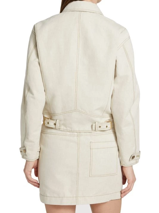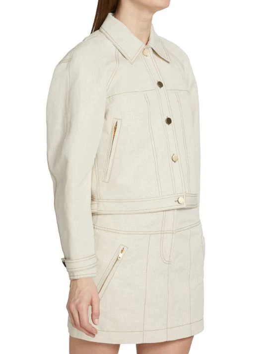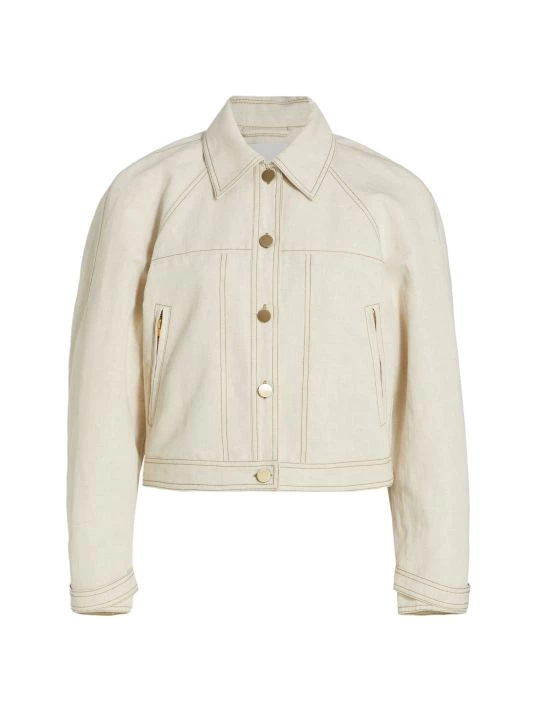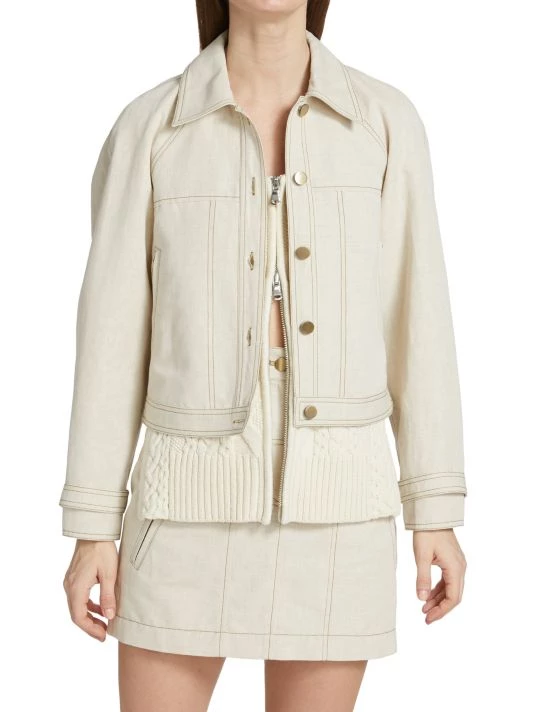 3.1 Phillip Lim’s Workwear Utility denim jacket is spun from a durable blend of cotton and linen. Adorned with contrast stitching, this sturdy design features a smooth goldtone button and front zip pockets.