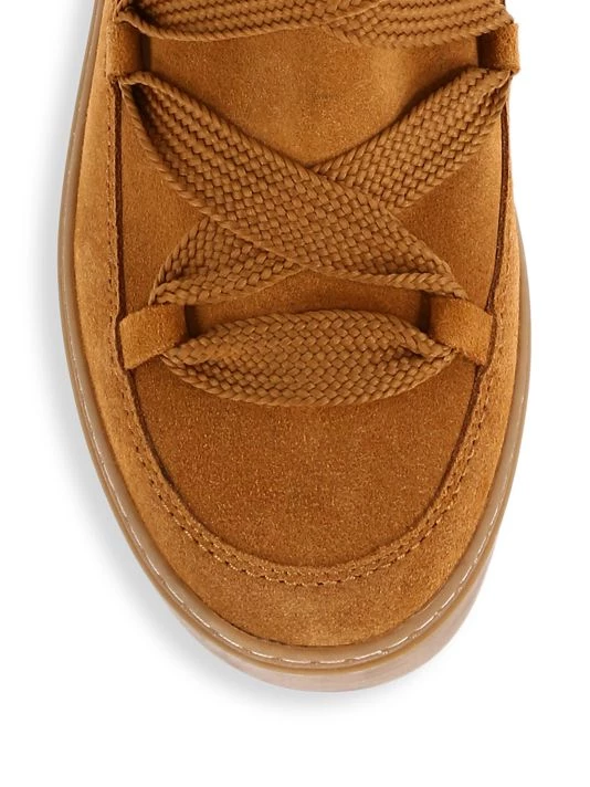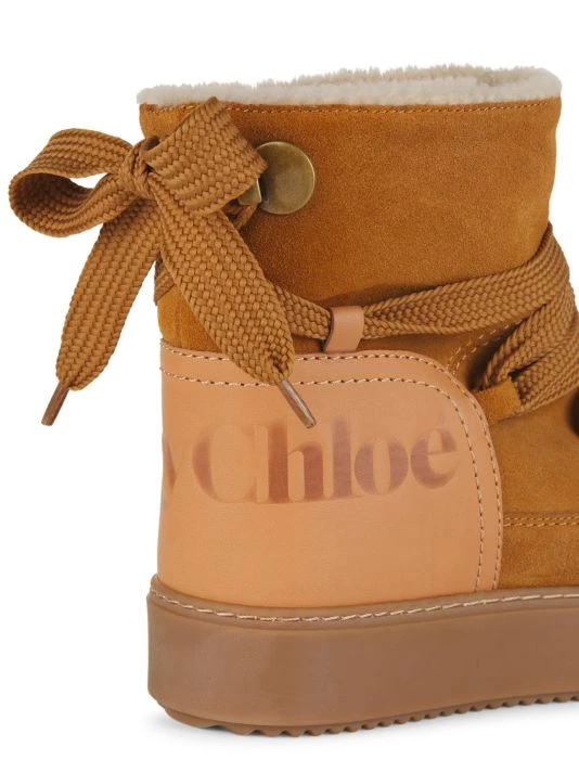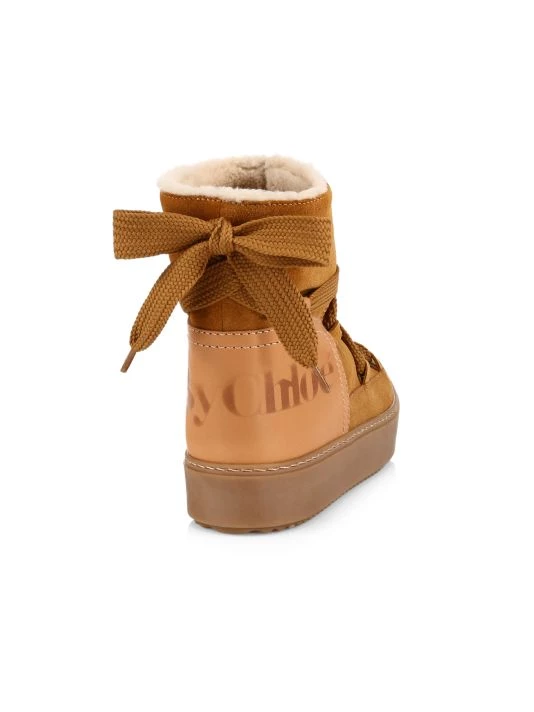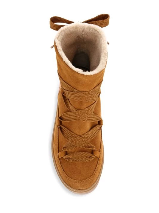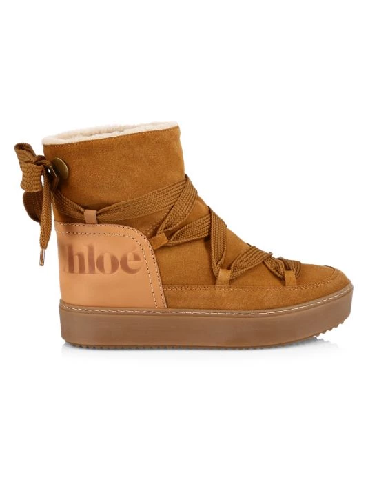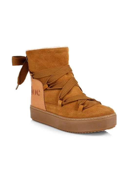 Crafted of fine suede with a luscious shearling lining, these ankle boots are topped with crisscrossed laces that tie at the ankle.