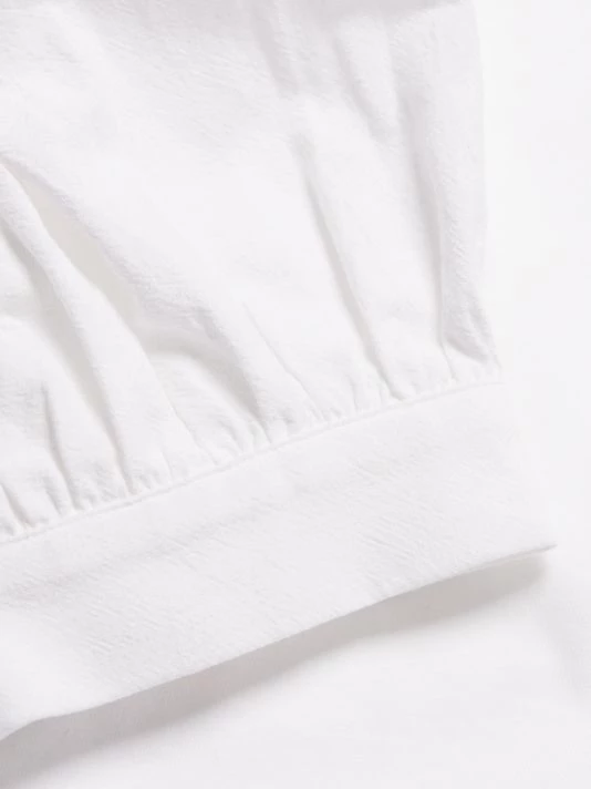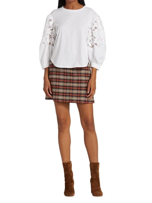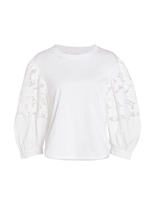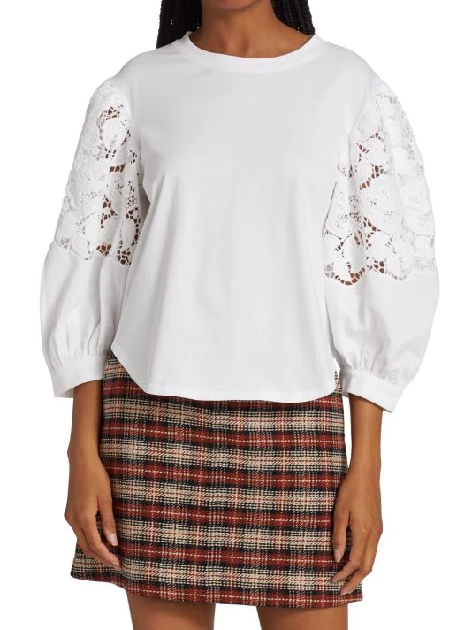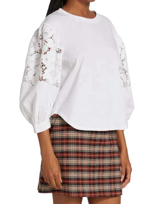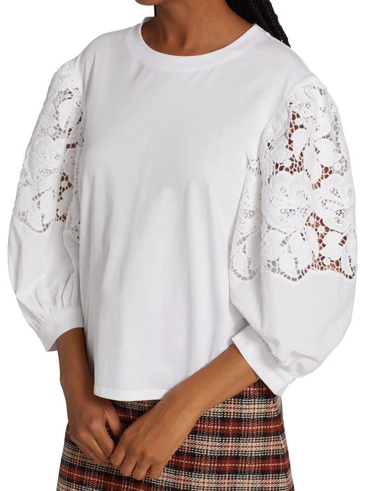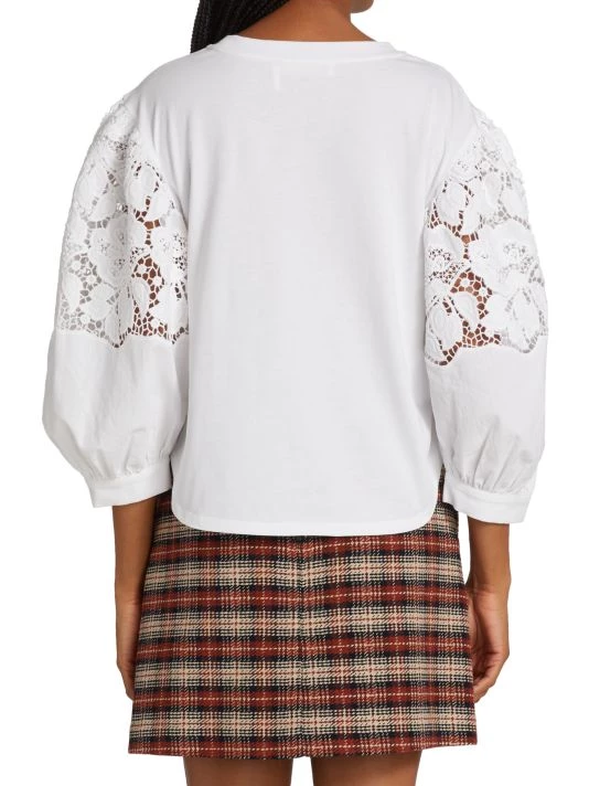 Inset floral lace embellishes the sleeves of this blouson cotton shirt.
