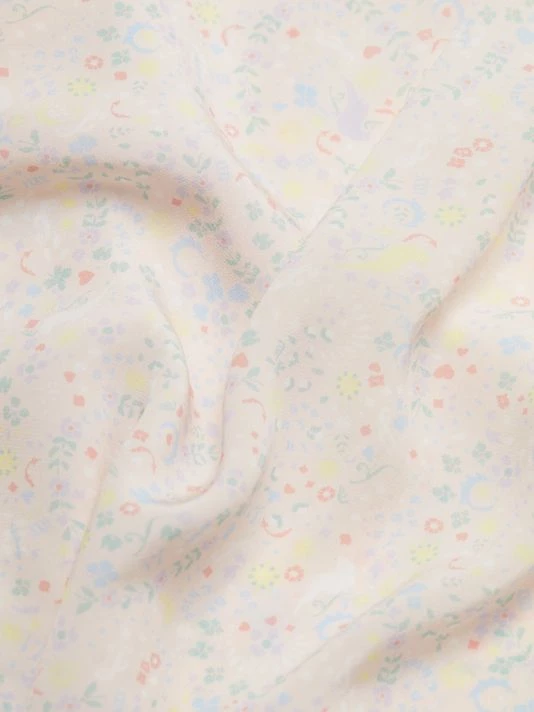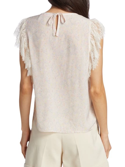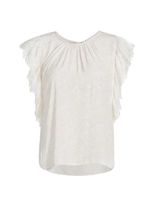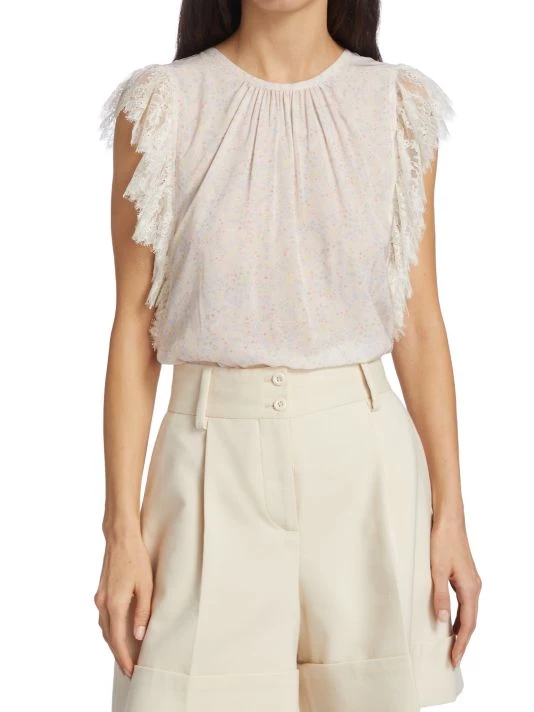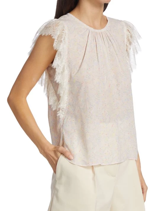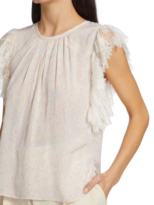 Lace flutter sleeves frame this lightweight blouse, printed with pale, dainty florals.