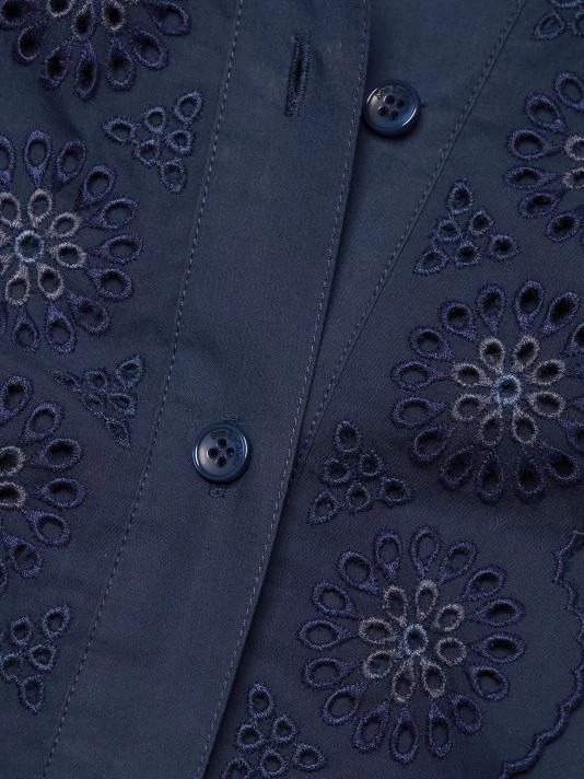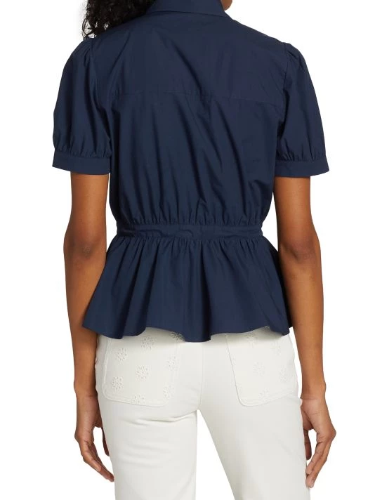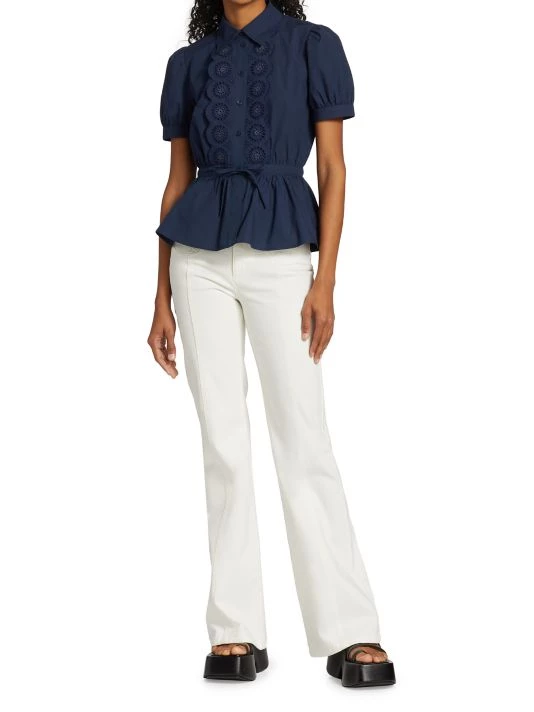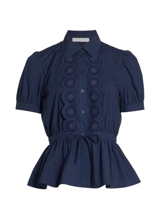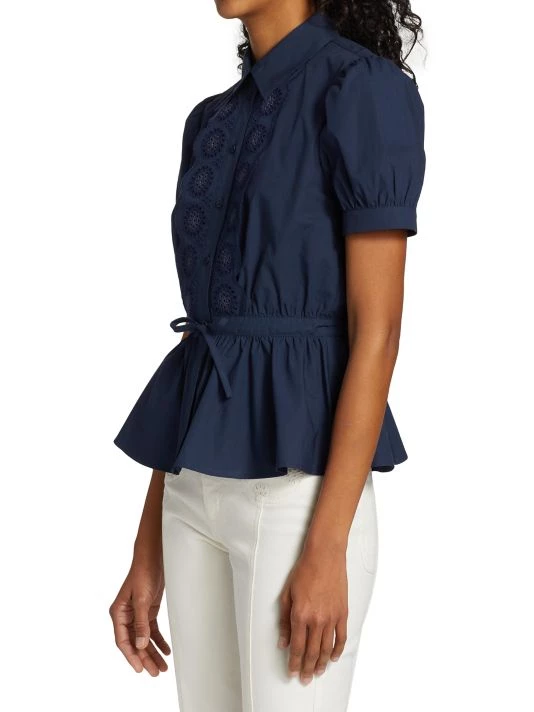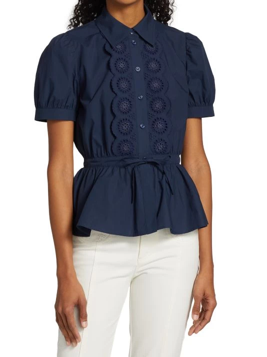 Eyelet embroidery details this cotton top, while a drawstring waist creates a peplum silhouette.