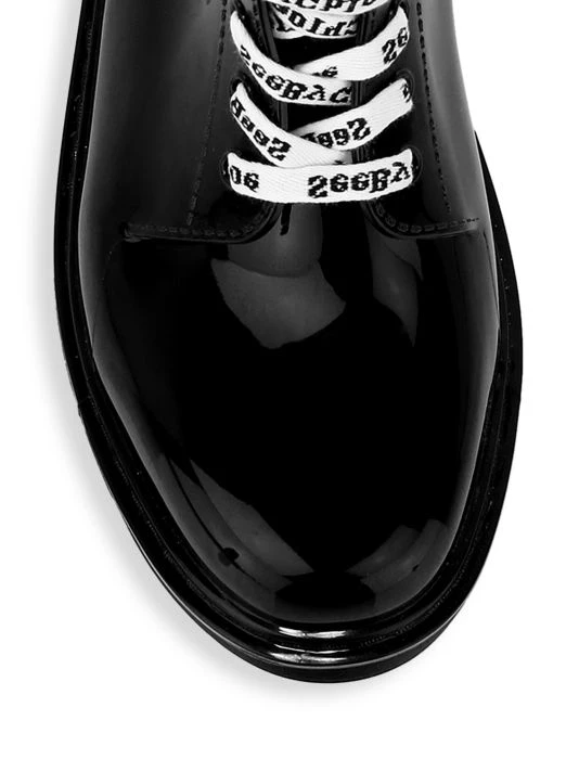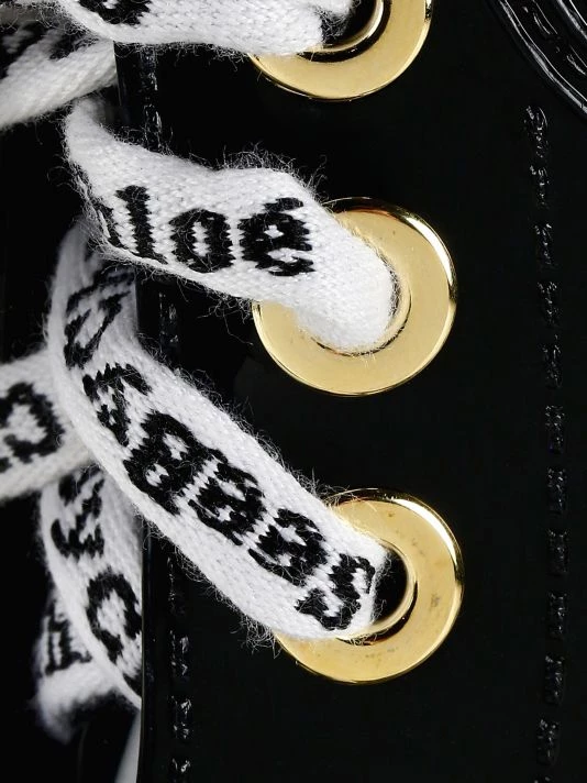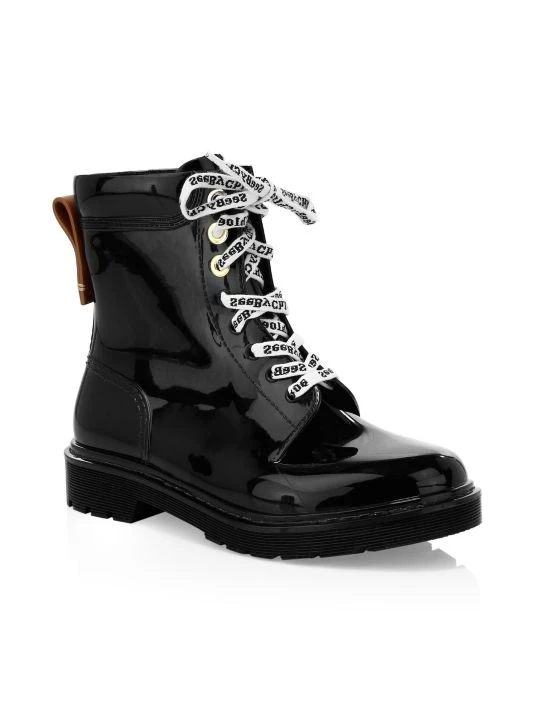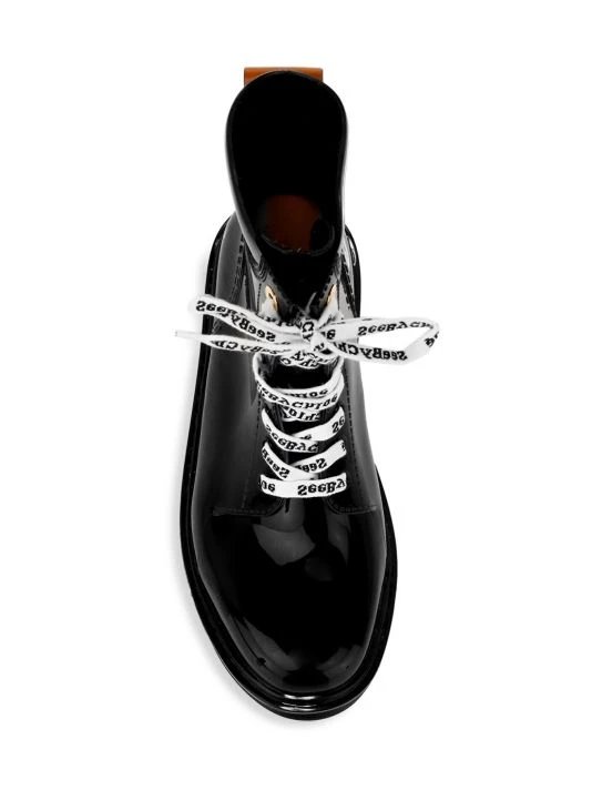 Glossy rain boots with moniker-flaunting laces and leather pull tabs.