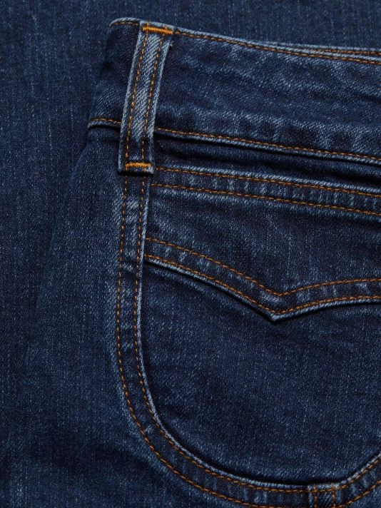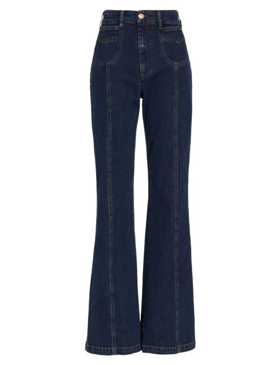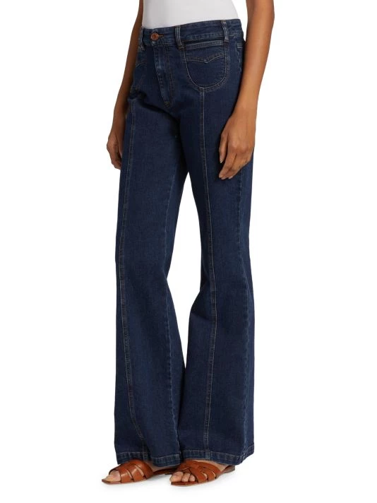 A center front seam flatters the silhouette of these `70s-style stretch flare jeans.