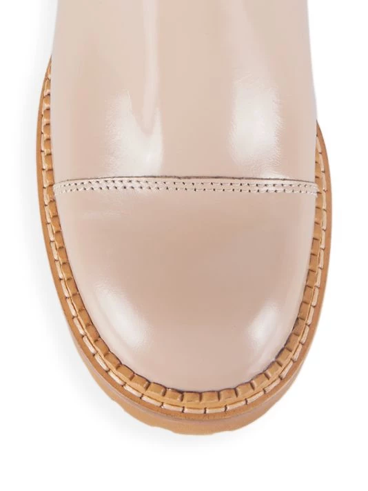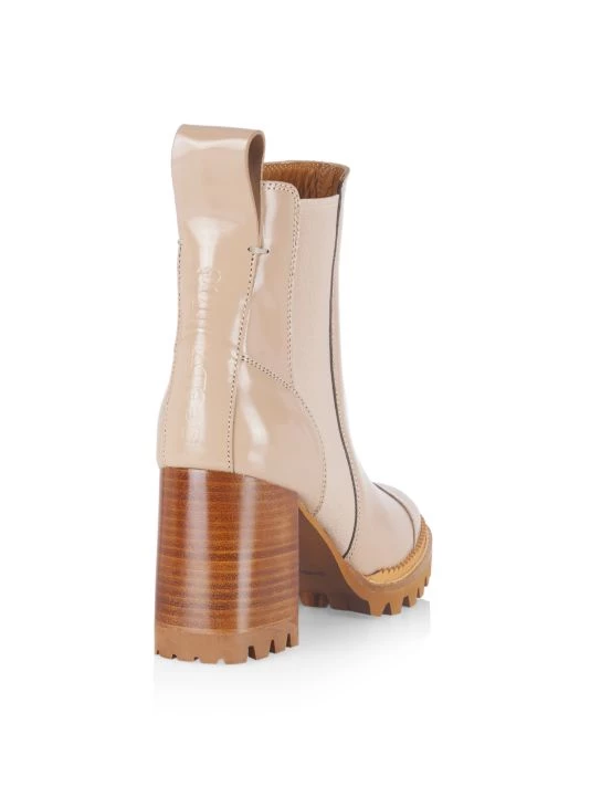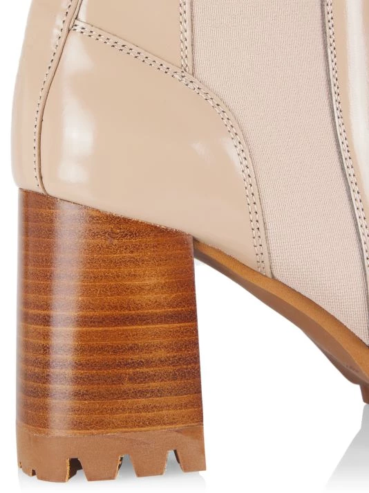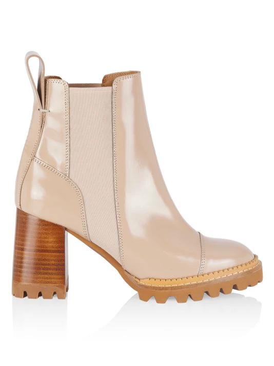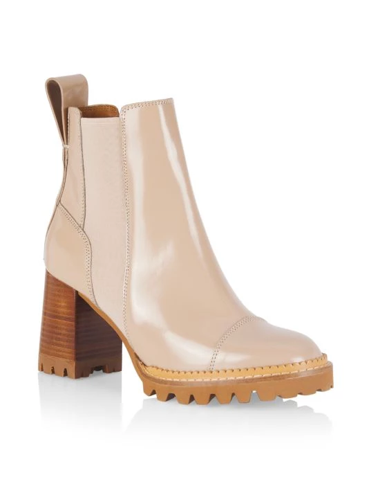 Crafted of polished leather in Spain, See by Chloé’s Mallory chelsea boots are anchored by a lugged block heel complemented by a scalloped trim with contrast stitching.