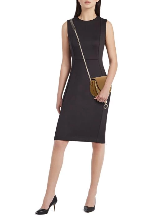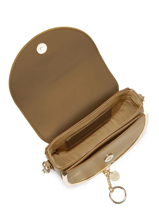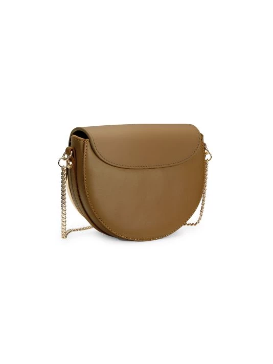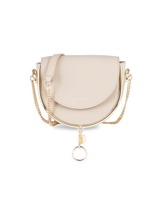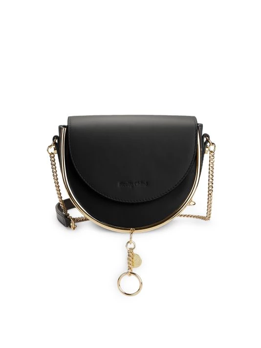 Leather saddle handbag featuring a bold metallic hardware ring and chain strap with leather trim.