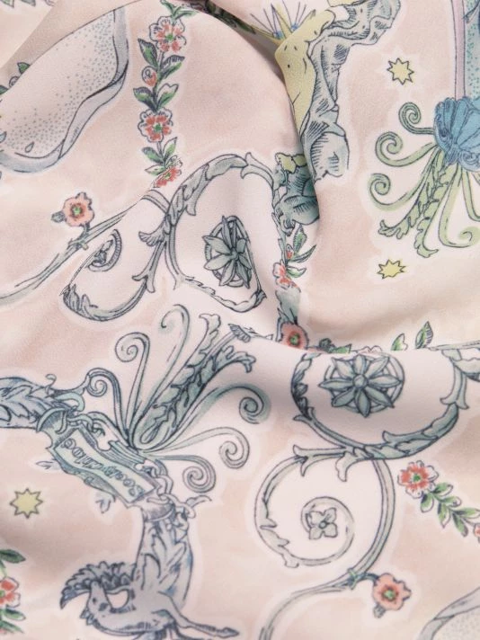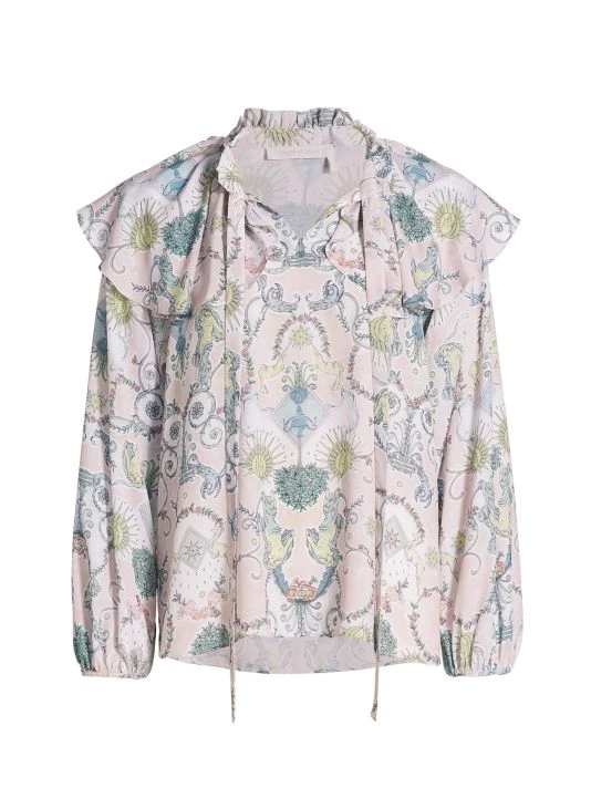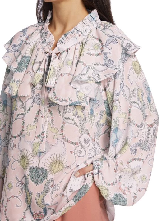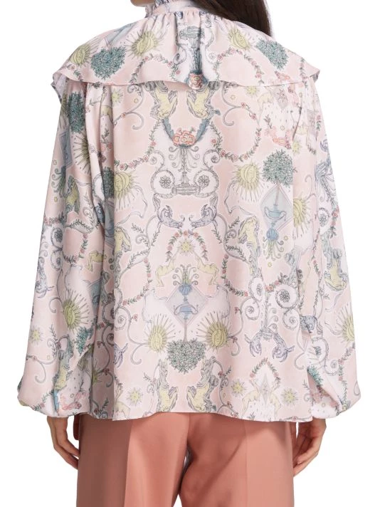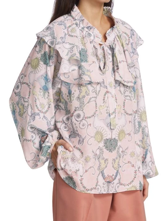 Designed with feminine detailing, this cape-style blouse features a whimsical allover print.