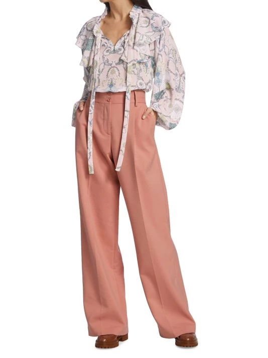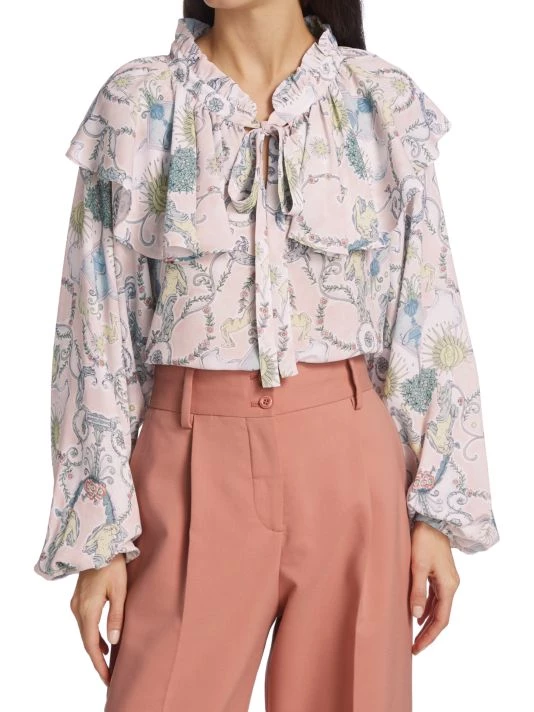 - Ruffled stand collar with self-tie