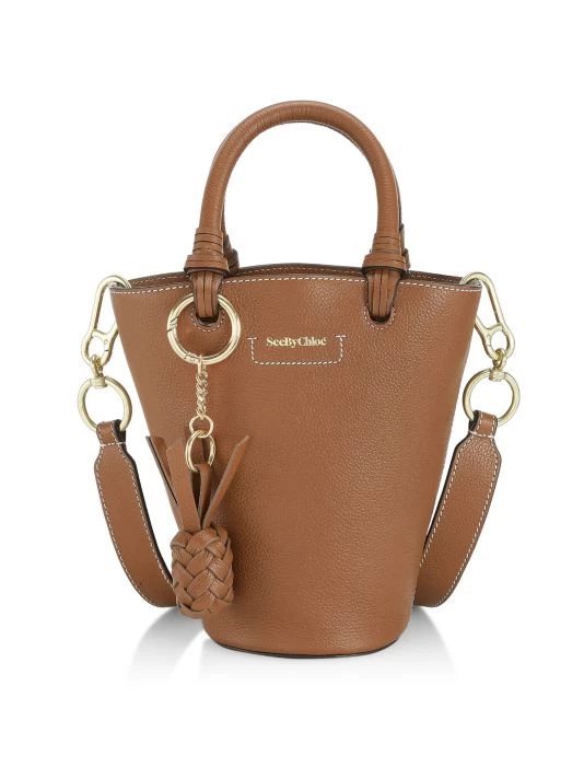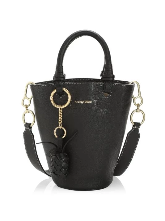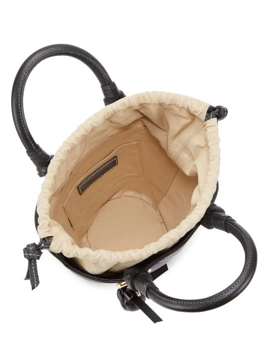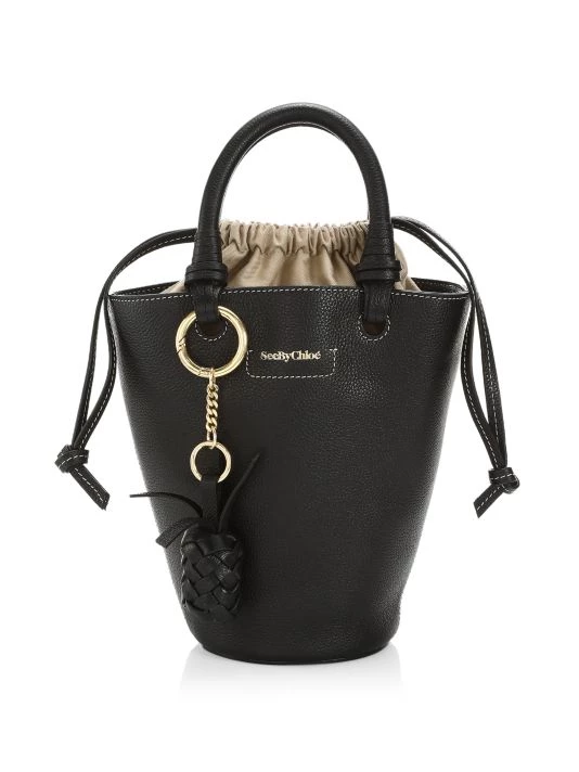 Structured bucket-style leather tote with a cotton drawstring lining is adorned with a woven pineapple charm at the handle.
