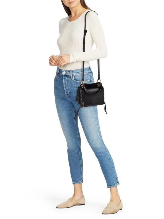 From the Tilda Collection. Smooth leather convertible top handle bag elevated with goldtone hardware, a logo charm and signature tassel details.